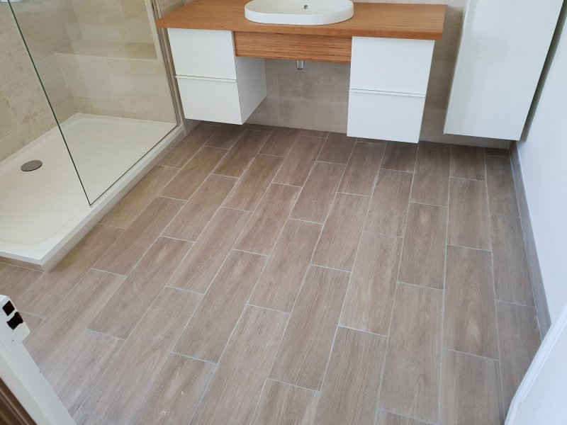 Chantier rénovation d’une salle de bain dans l’Aude Remplacement du plan vasque + crédence en stratifié décor Polyrey Fizzy Lune...